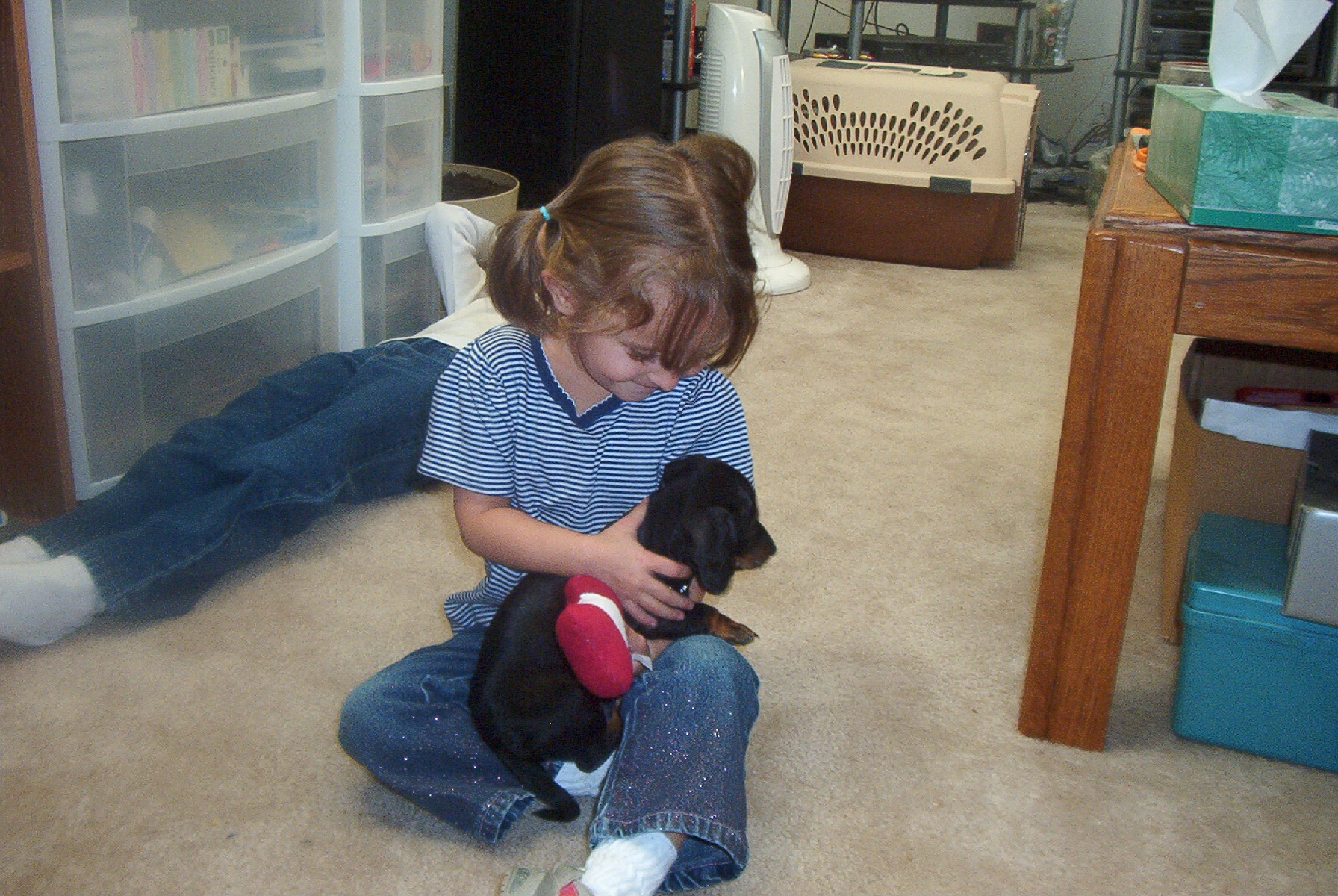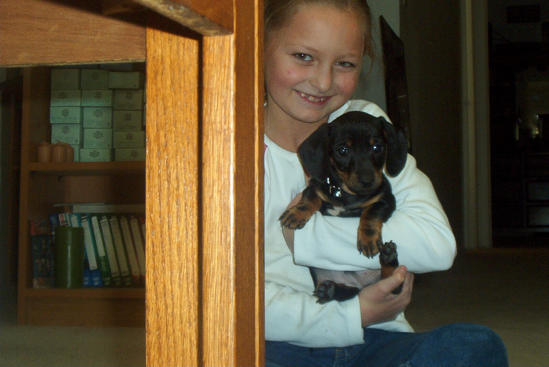 This is Haley Eickmann (Stephen and Kris) loving their new dachshund named 'Oskar'.